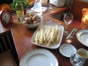 The first week of May, I begin rehearsals in Germany with Chandira and Sudhananda for the new Moksha project. It took some days to build strength in my hands and develop fingertip callousness again, but if there was anything to be called pain, it was a sweet one. We stayed in Chandira’s flat. It is in an old castle (a real one!) from medieval times. It has no ghosts I am relieved to report, but it is a silent place good for rest and rejuvenation. My longing since a year has been to play more music and spend less time organizing and being on the Net. These days certainly nourished that desire. Everyday we fine-tuned our sound and repertoire. We took breaks for walks through the surrounding forest, nice tea-times together, and delicious dinners with all of us cooking. Sudhananda is something of a nature spirit, so we enjoyed his steamed nettles and fresh dandelion salad greens, all in season at the time; also spargel (white asparagus), another spring delicacy in Europe.